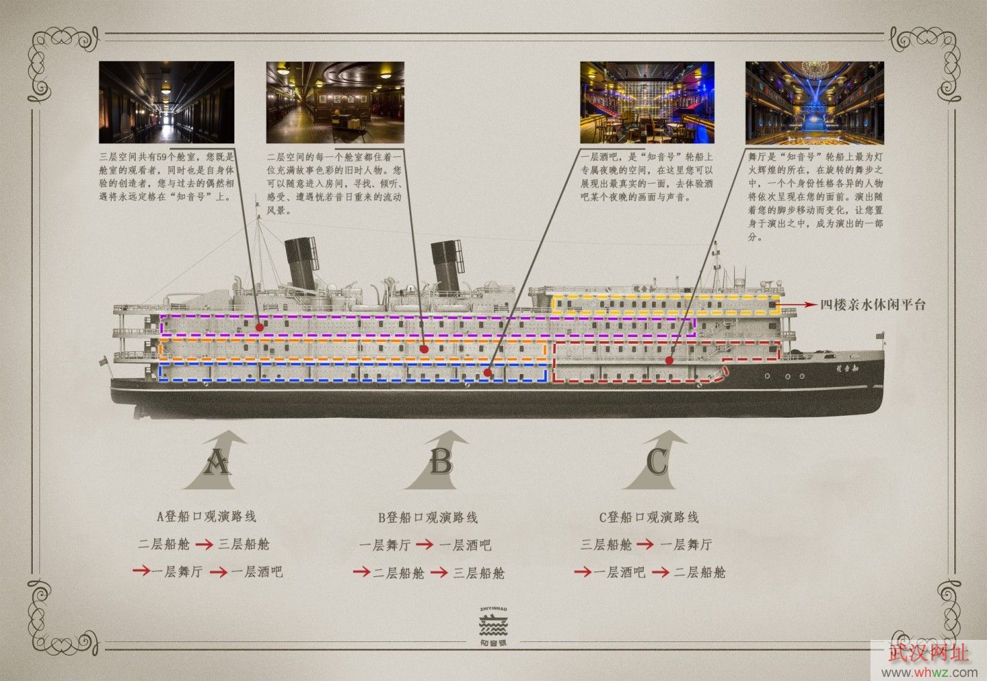 為使游客有更好的觀演體驗(yàn),《知音號》分為A、B、C三個登船口進(jìn)入“知音號”內(nèi),三條路線入口和路線不同但觀看內(nèi)容是相同的。